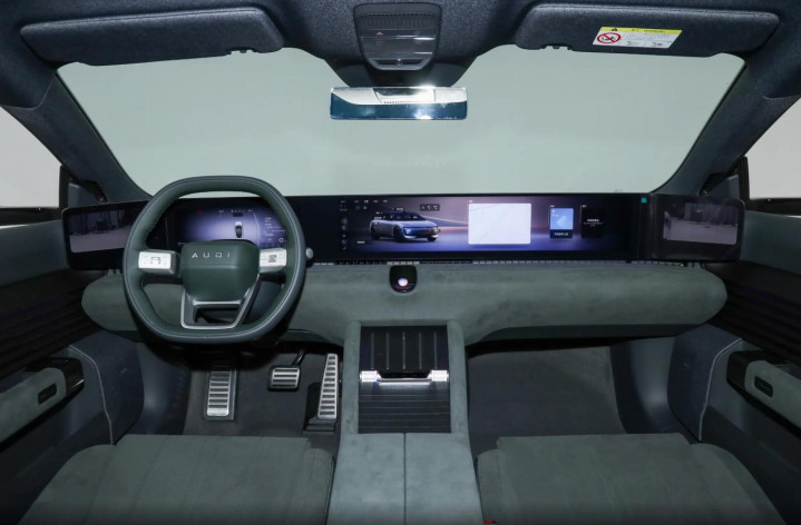 在中控区域,仪表台、中控屏、副驾娱乐屏以及两侧电子外后视镜屏形成了一个59英寸的贯穿“带鱼”屏,科技感爆棚,看起来也很有科幻感。中控屏大小为27英寸,搭载了AUDI OS车机系统和高通骁龙8295芯片,操作流畅,响应速度快,能够同时执行多个任务,支持手机App远程控制、5G网络、OTA升级,此外还支持CarPlay、HUAWEI HiCar和Carlink。语音识别系统相当智能,无论坐在前排还是后排,都能够向语音小助手“奥迪”下达指令,而“小助手”的反应也是相当迅速,甚至能够理解方言。AR-HUD技术让我在开车时可以直观地在视线中看到导航等关键信息,避免低头或偏头的麻烦。四辐式平底方向盘手感扎实,配有多个实体按键,既能加热还支持电动调节。