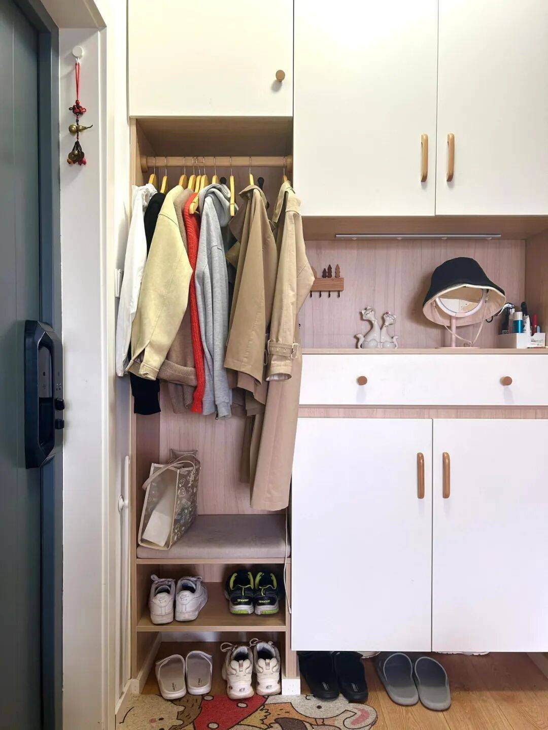 我家玄关倒是有个小衣柜,但由于没有做柜门,衣服挂上去显得特别乱,有条件的家庭还是做全封闭设计吧。