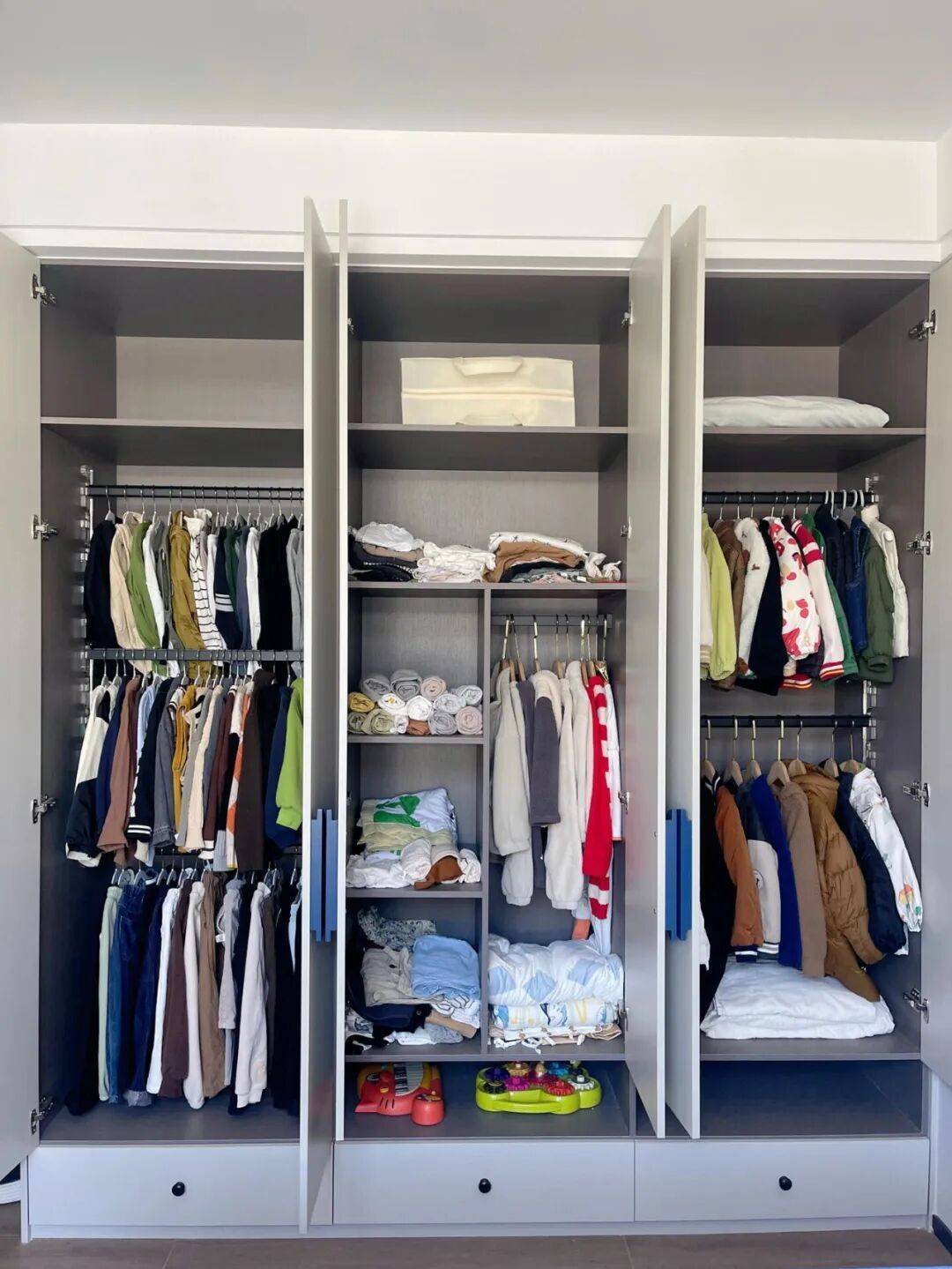 所以,我们在设计衣柜时只做挂衣区和抽屉就够了,能挂的就全部挂起来,不能挂的用抽屉收纳就够了。