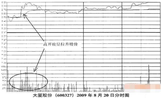 如下图所示,从大厦股份(600327)2009年8月20日的分时图中可以看出,股价开盘即大涨8.54%,并且开盘后成交量迅速膨胀,股价在瞬时间内即被拉入了涨停板。放大成交量的过程正是庄家有意为之的抢筹过程。