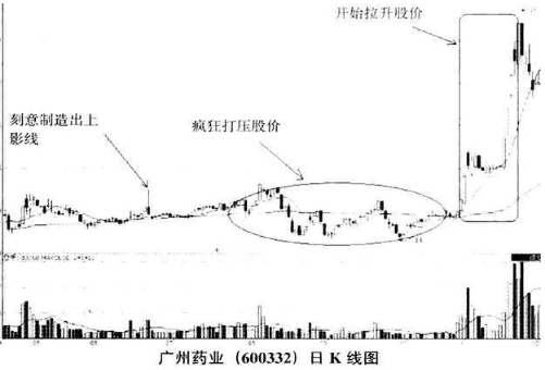 如下图所示,从广州药业(600332)的日K线图中可以看出,庄家刻意制造的上影线很长的阴线形态是非常显眼的。在这之后不久,庄家对该股的打压就开始了,股价无缘无故地缩量阴跌。三个月的洗盘过后,开盘即出现拉涨停,股价以迅雷不及掩耳之势快速地上冲了。
