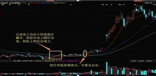 "蚂蚁上树"是某股票的K线经过长期的下跌后,逐步企稳碎步攀升,同样这也标志着主力又在开始重新吸货。股价历经长时间的下跌之后进行充分整理,两条小幅向右下方倾斜的主均线相距特别近或者说基本持平状态。当13日均线由下跌开始走稳,股价突破13日均线之后,以连续上攻的小阳线缓步盘升,把股价轻松地送上55日均线。我们把这几根持续上升的小阳线称之为“蚂蚁上树”。