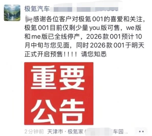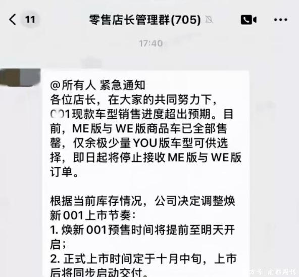 9月22日七星配资 ,南都·湾财社记者留意到,多个社交媒体平台流传疑似极氪内部工作群通知。内容显示,现款极氪001已售罄,极氪将提前至9月23日开启焕新001的预售,上市时间则按照原计划十月中旬,届时将同步开启交付。记者从多个门店销售及极氪处获悉,消息属实。